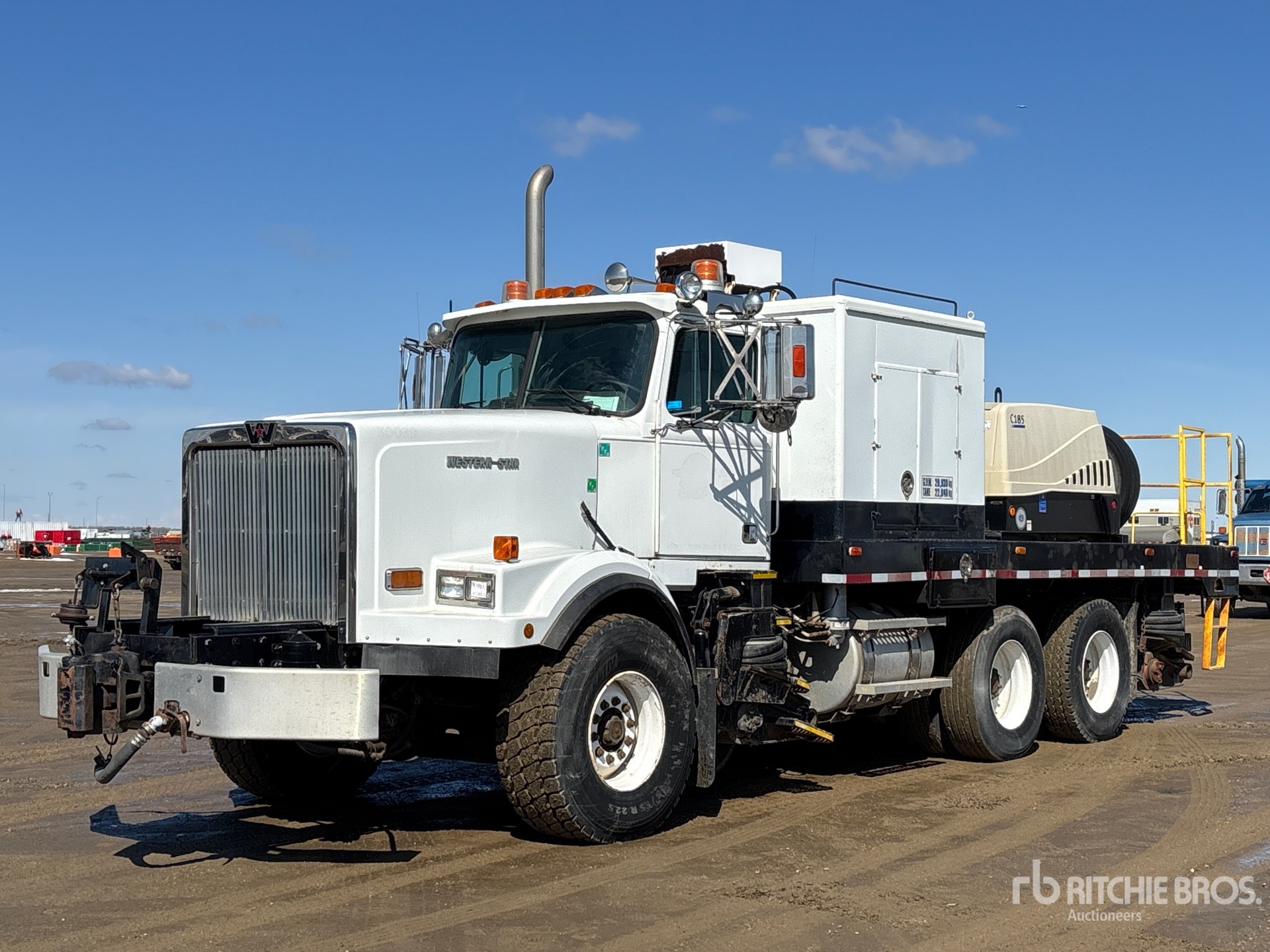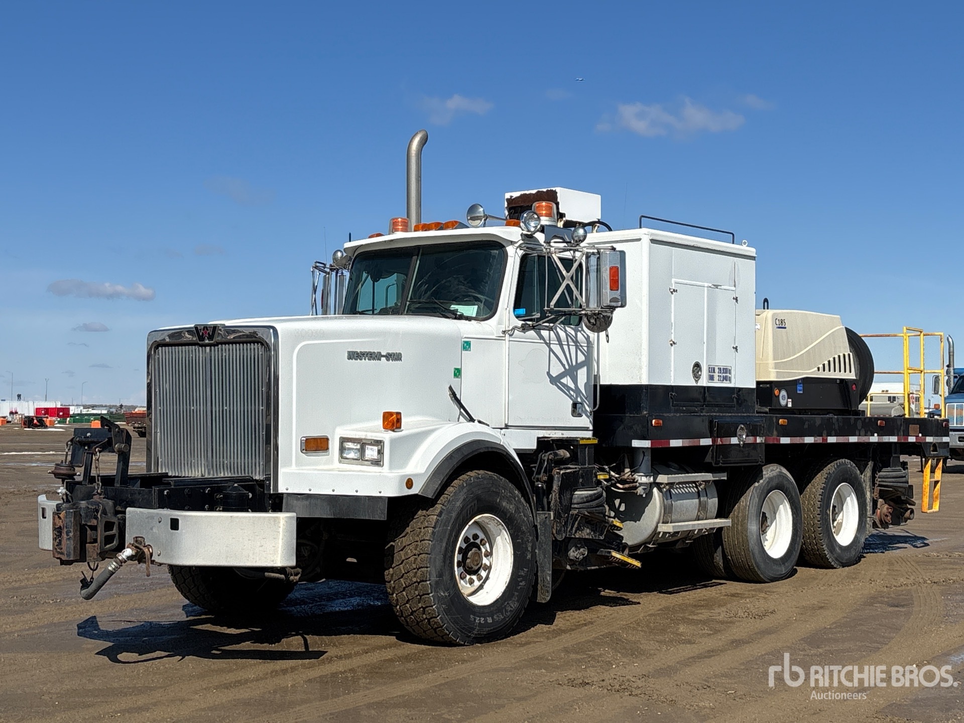 Cat 3406E 6 Cylinder 14.6 L Diesel 475 hp Engine, 1996 US EPA Label, CARB Compliant, Engine Brake, Eaton Fuller RTO-16109B 9-Speed Automatic Transmission, 18798 lb Front Axle, 28800 lb Rears, Dana DT-461P Drive Axles, 47598 lb GVWR, 445/65R22.5 Front Tires, 315/80R22.5 Rear Tires, Double Frame, Neway Air Ride Suspension, 188 in Wheelbase, 19 ft 6 in Body, Doosan C185 Diesel Air Compressor