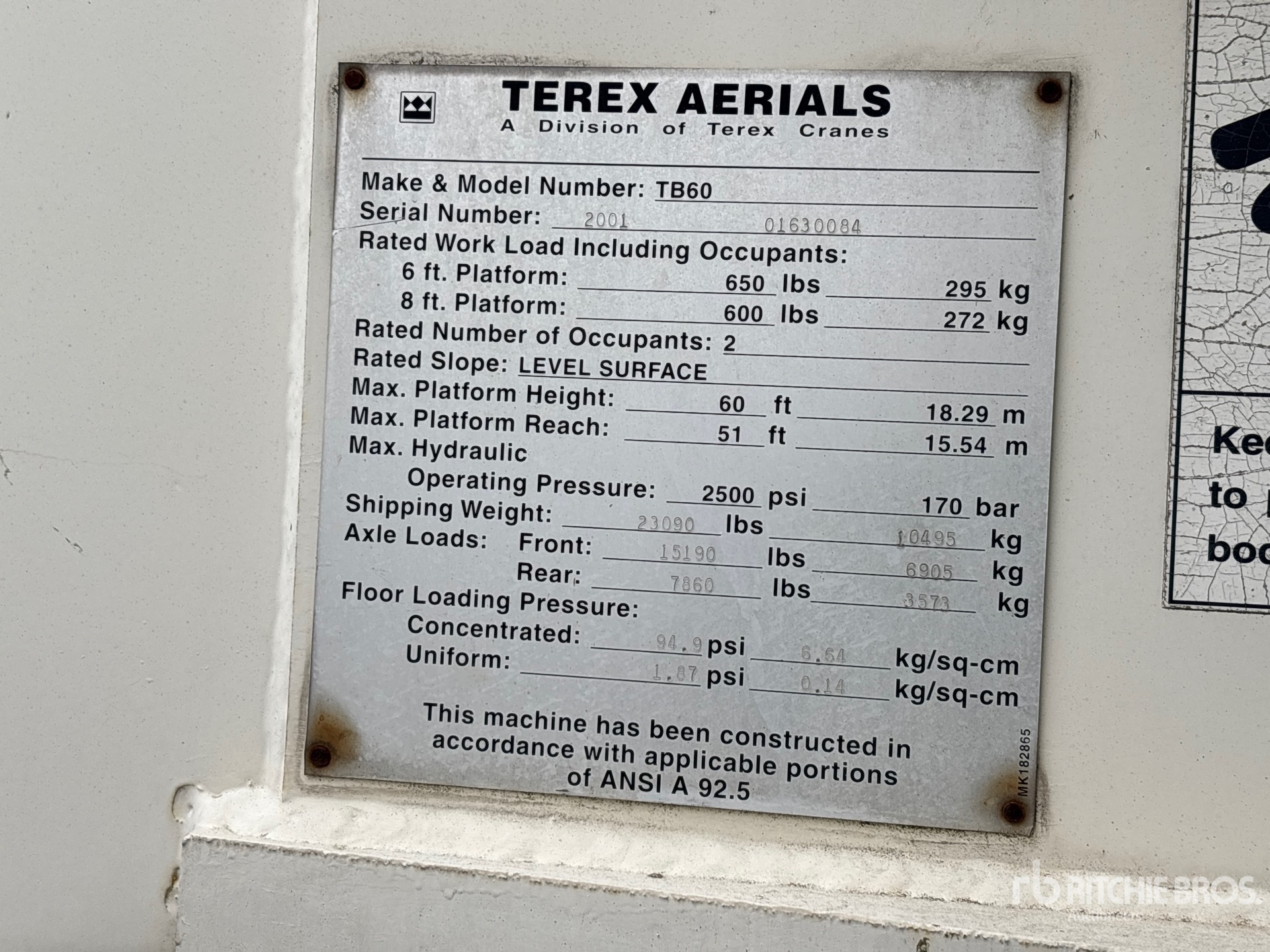 機械の詳細情報は範囲に制限があり、Ritchie Bros. Auctioneersは、ここに明記するもの以外の設備やコンポーメントの検査は行っていません。特に明記されていない限り、明示的または黙示的かにかかわらず、Ritchie Bros.は機械やそのコンポーネントに関する一切の責任を負わないものとします。機能性、快適性、あるいは関係官庁や規制機関が定める安全基準や要件に関する準拠性、特定目的への適合性、または商品性に関する表明や保証も含まれますが、これらに限るわけではありません。お客様には入札される前に必ず機械の検品を行うことをお勧めします。