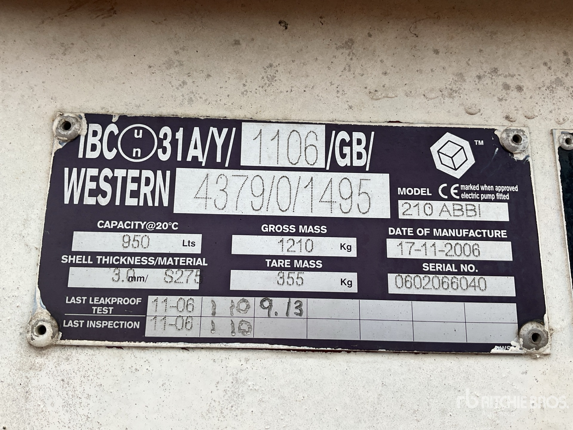 2006 Western 210ABBI 950 L Skid Mounted Steel タンク