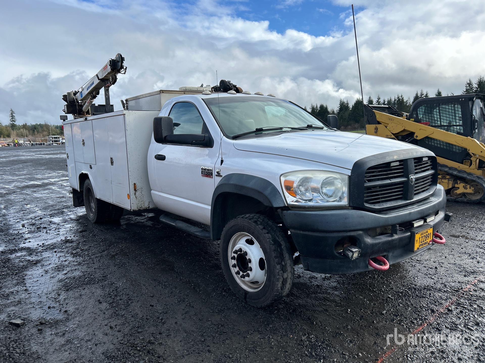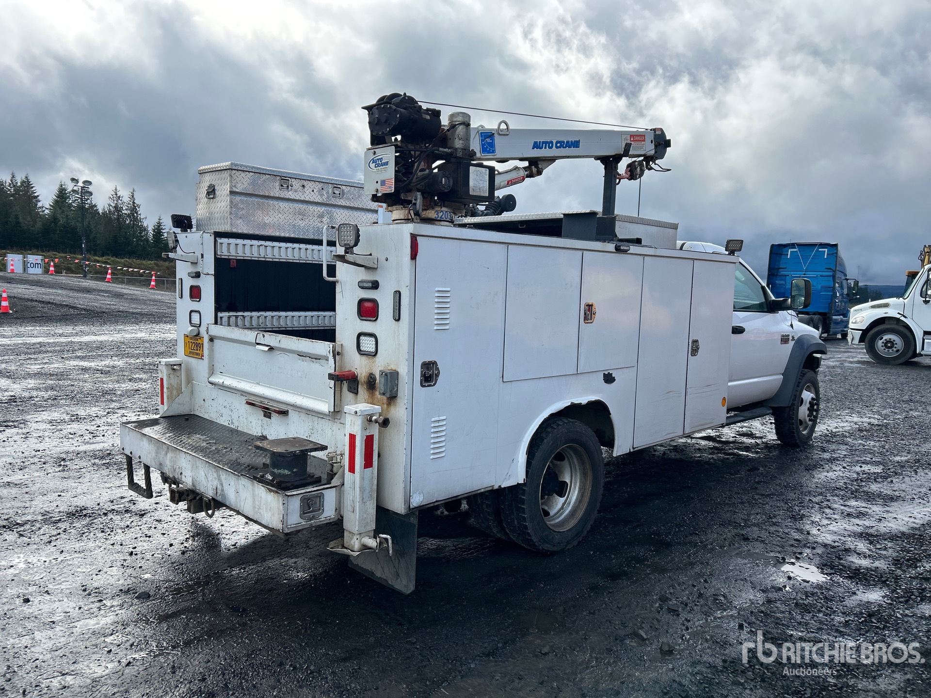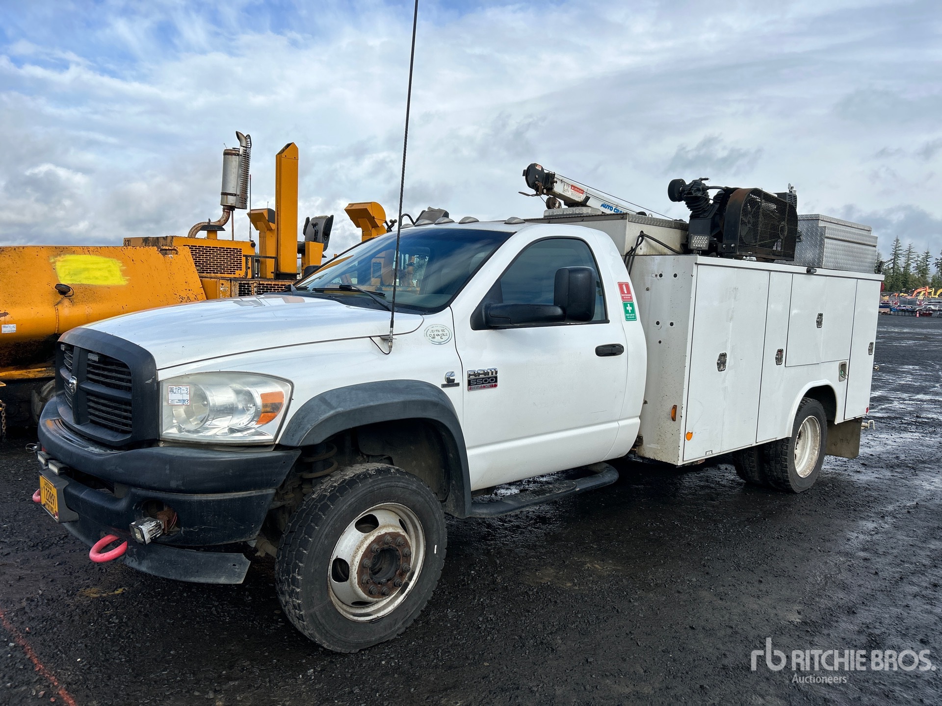 Cummins 6 Cylinder 6.7 L Diesel Engine, Exhaust Brake, Automatic Transmission, 7000 lb Front Axle, 13500 lb Rears, 19500 lb GVWR, 225/70R19.5, Spring Suspension, 168 in Wheelbase, 11 ft Body, Manual Stabilizers, Auto Crane 3203 PRX 2200 lb 3 Section Electric Crane, Ingersoll-Rand 2475 Gasoline Air Compressor
