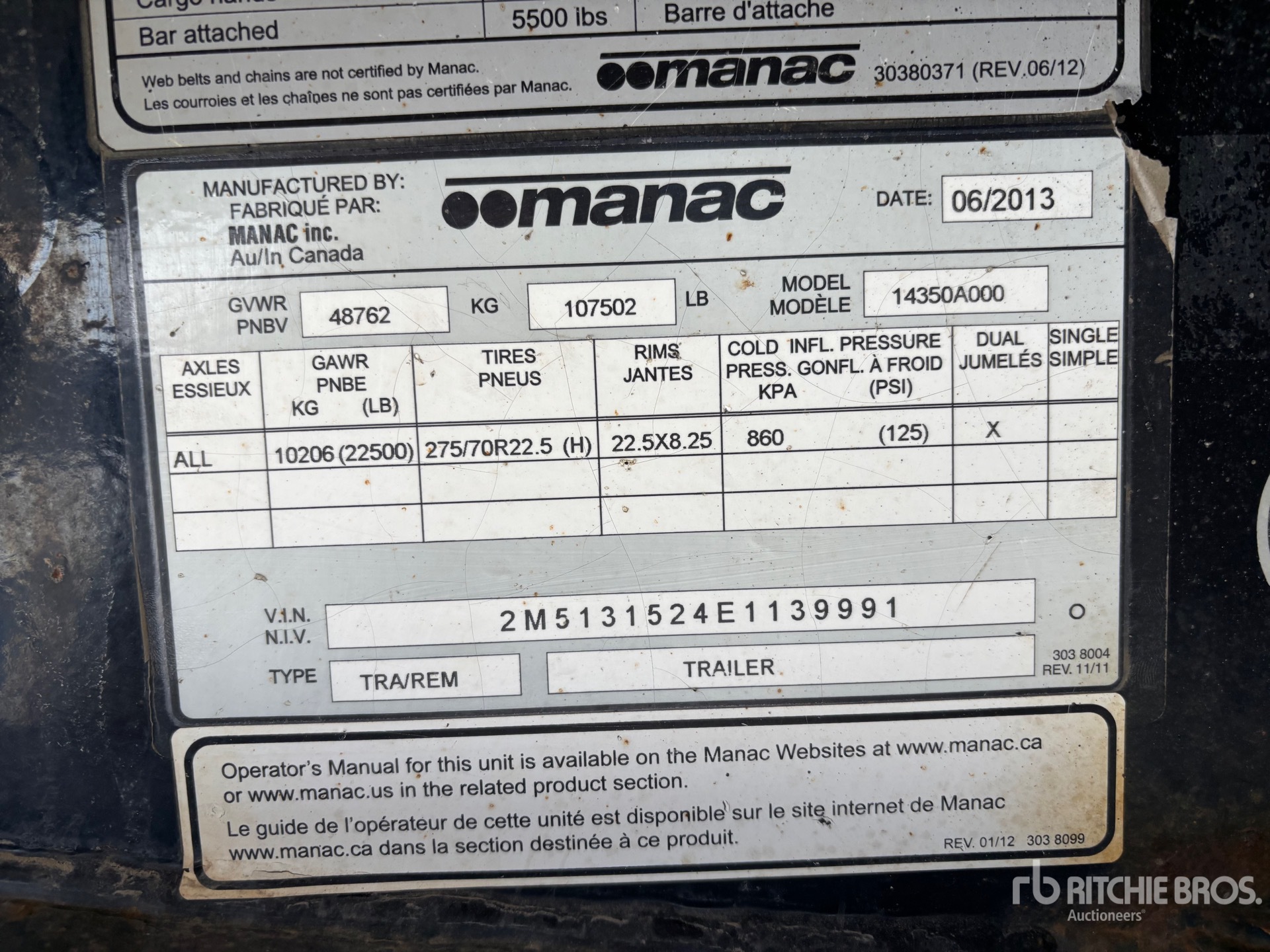 機械の詳細情報は範囲に制限があり、Ritchie Bros. Auctioneersは、ここに明記するもの以外の設備やコンポーメントの検査は行っていません。特に明記されていない限り、明示的または黙示的かにかかわらず、Ritchie Bros.は機械やそのコンポーネントに関する一切の責任を負わないものとします。機能性、快適性、あるいは関係官庁や規制機関が定める安全基準や要件に関する準拠性、特定目的への適合性、または商品性に関する表明や保証も含まれますが、これらに限るわけではありません。お客様には入札される前に必ず機械の検品を行うことをお勧めします。
