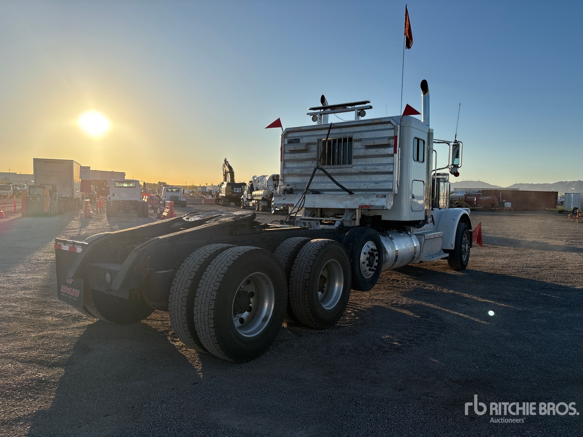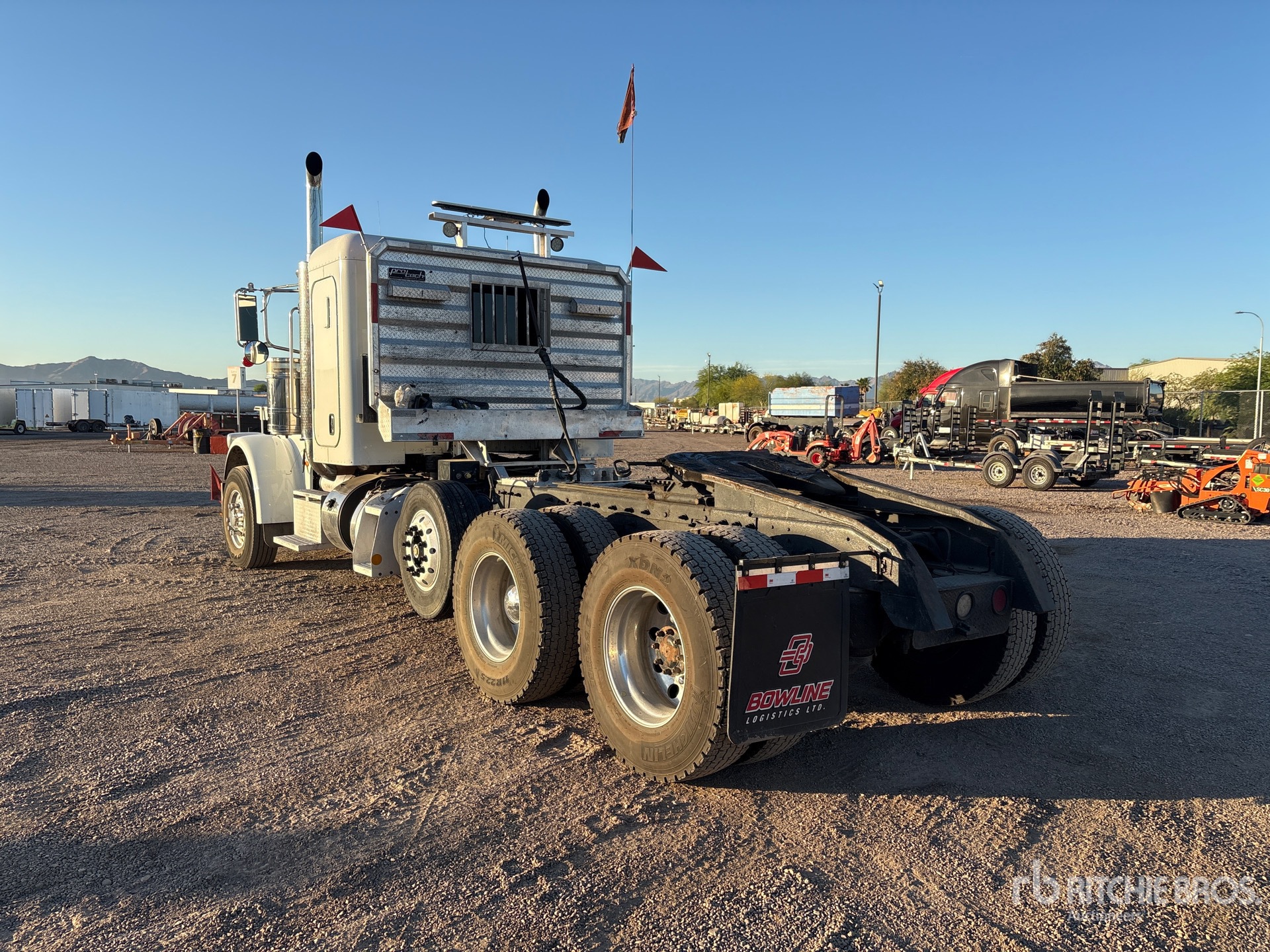 Cummins ISX Engine, 18180 lb Front Axle, 46000 lb Rears, 64180 lb GVWR, 36 in Flat Top Sleeper Cab, 250 in Wheelbase, Air Suspension, Air Lift Pusher Axle, Aluminum Wheels, 315/80R22.5 Front Tires, 11R22.5 Rear Tires, Dual Steering Boxes, Double Frame, Air Sliding 5th Wheel, Dual Fuel Tanks, Headache Rack