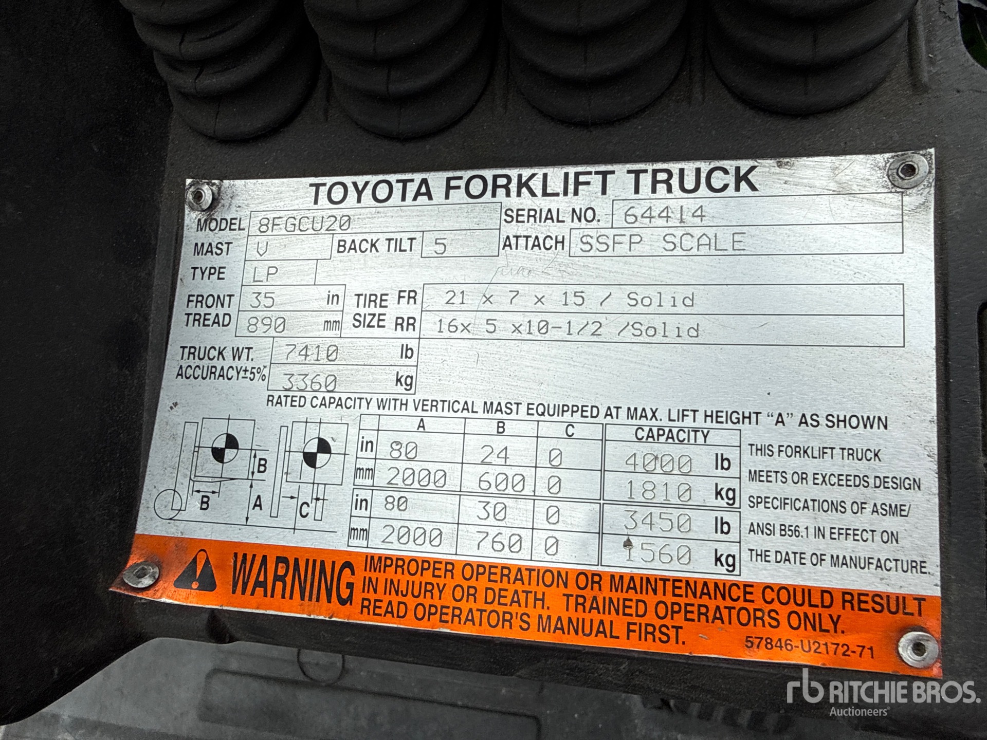 機械の詳細情報は範囲に制限があり、Ritchie Bros. Auctioneersは、ここに明記するもの以外の設備やコンポーメントの検査は行っていません。特に明記されていない限り、明示的または黙示的かにかかわらず、Ritchie Bros.は機械やそのコンポーネントに関する一切の責任を負わないものとします。機能性、快適性、あるいは関係官庁や規制機関が定める安全基準や要件に関する準拠性、特定目的への適合性、または商品性に関する表明や保証も含まれますが、これらに限るわけではありません。お客様には入札される前に必ず機械の検品を行うことをお勧めします。