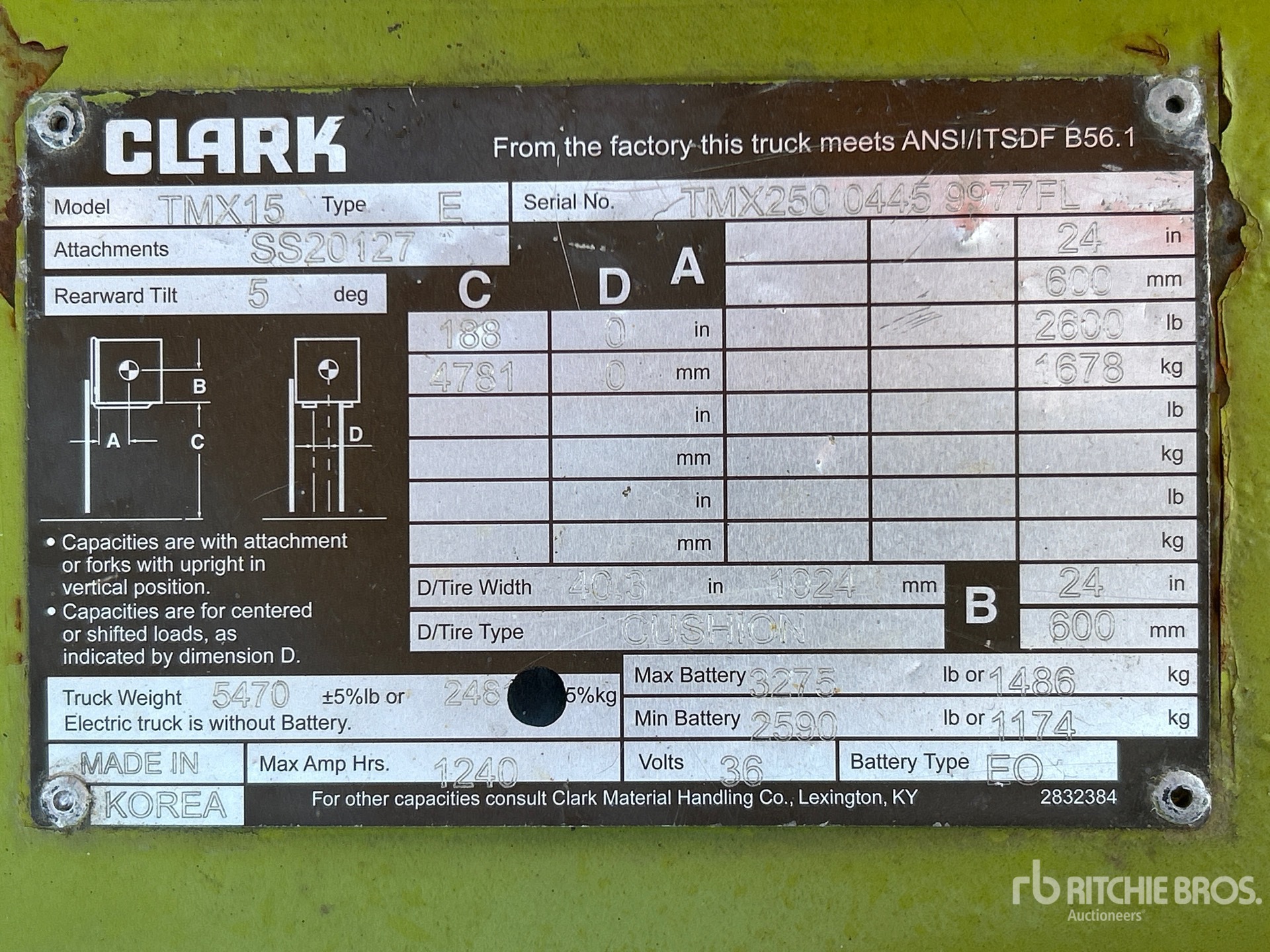 機械の詳細情報は範囲に制限があり、Ritchie Bros. Auctioneersは、ここに明記するもの以外の設備やコンポーメントの検査は行っていません。特に明記されていない限り、明示的または黙示的かにかかわらず、Ritchie Bros.は機械やそのコンポーネントに関する一切の責任を負わないものとします。機能性、快適性、あるいは関係官庁や規制機関が定める安全基準や要件に関する準拠性、特定目的への適合性、または商品性に関する表明や保証も含まれますが、これらに限るわけではありません。お客様には入札される前に必ず機械の検品を行うことをお勧めします。