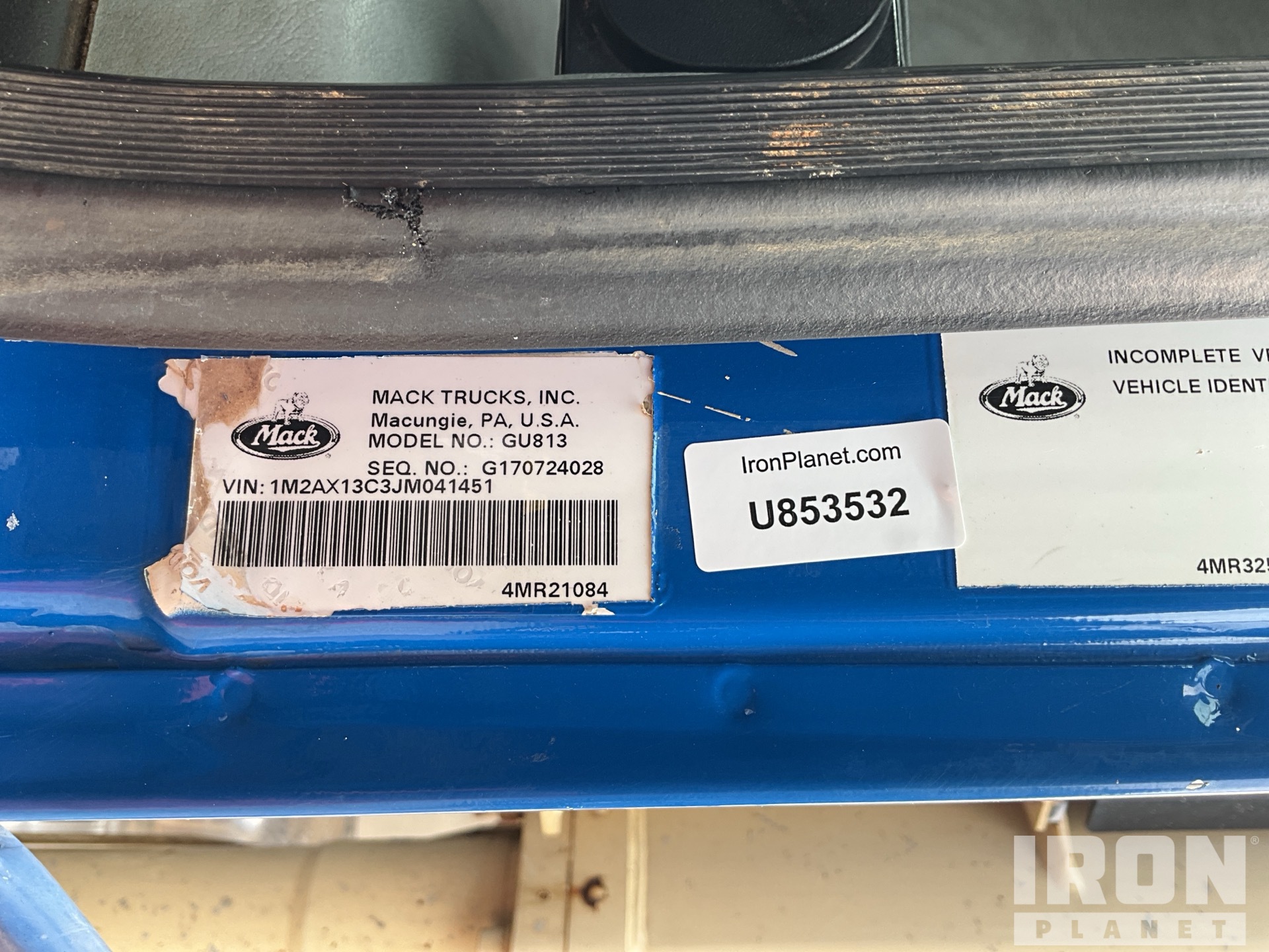 Mack MP7 6 Cylinder 10.8 L Diesel 425 hp Engine, 2017 US EPA Label, Requires Diesel Exhaust Fluid, 10374 Engine hrs, Engine Brake, Allison Manual Transmission, 20000 lb Front Axle, 44000 lb Rears, MACK Drive Axles, 64000 lb GVWR, Air Ride Cab, Aluminum Wheels, 425/65R22.5 Front Tires, 11R22.5 Rear Tires, Dual Steering Boxes, Camelback Spring Suspension, 269 in Wheelbase, PTO, Radio and Cable Remote Controls, Boom Light, Outrigger Pads, EBC (Ergonic Boom Control)