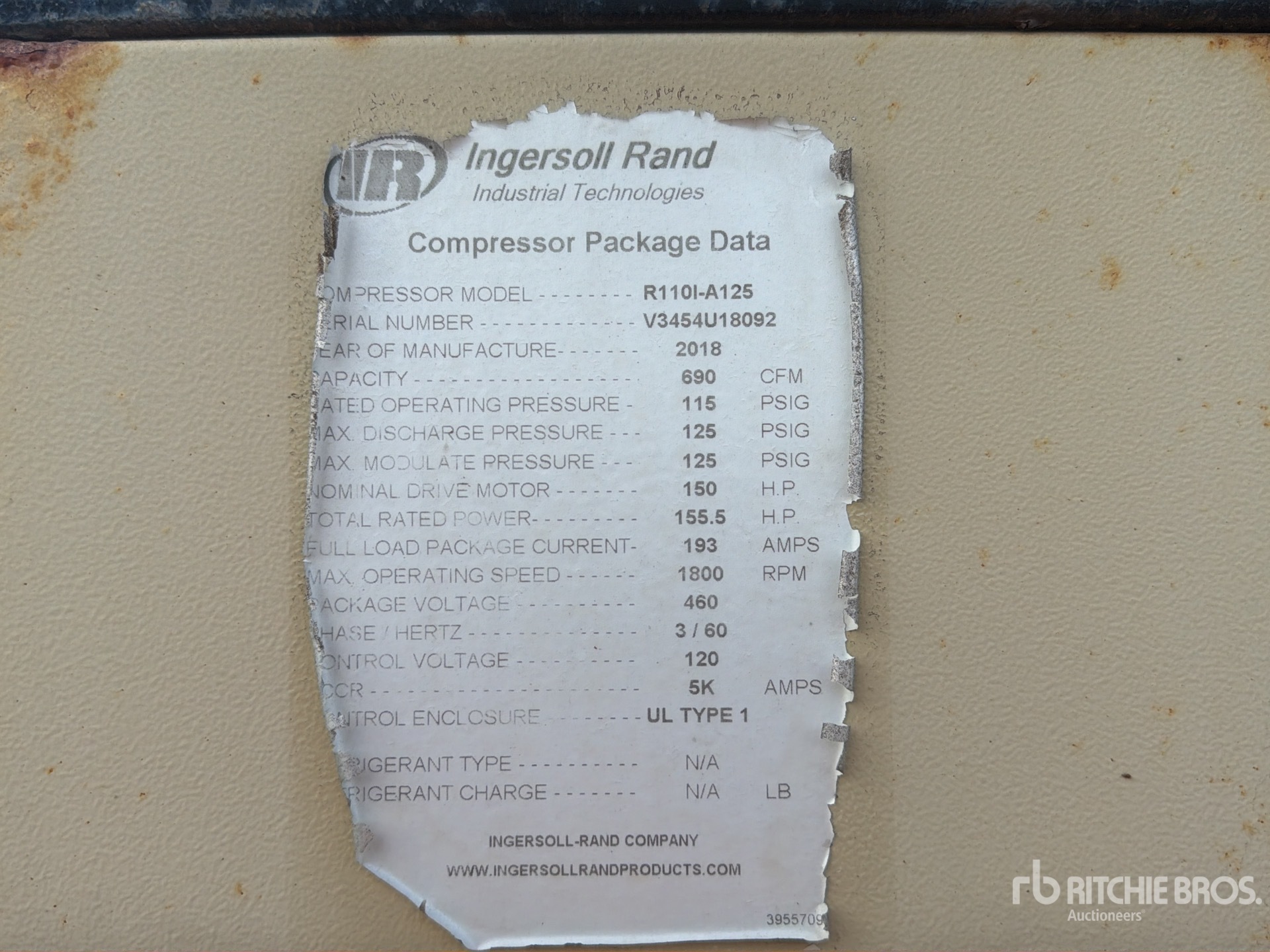 2018 Ingersoll Rand R1101-A-125PSI 690 cfm Skid-Mounted コンプレッサー