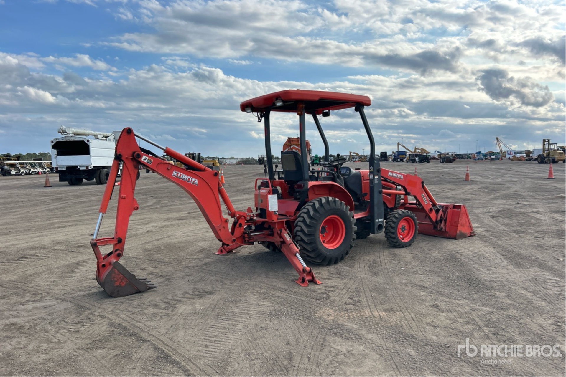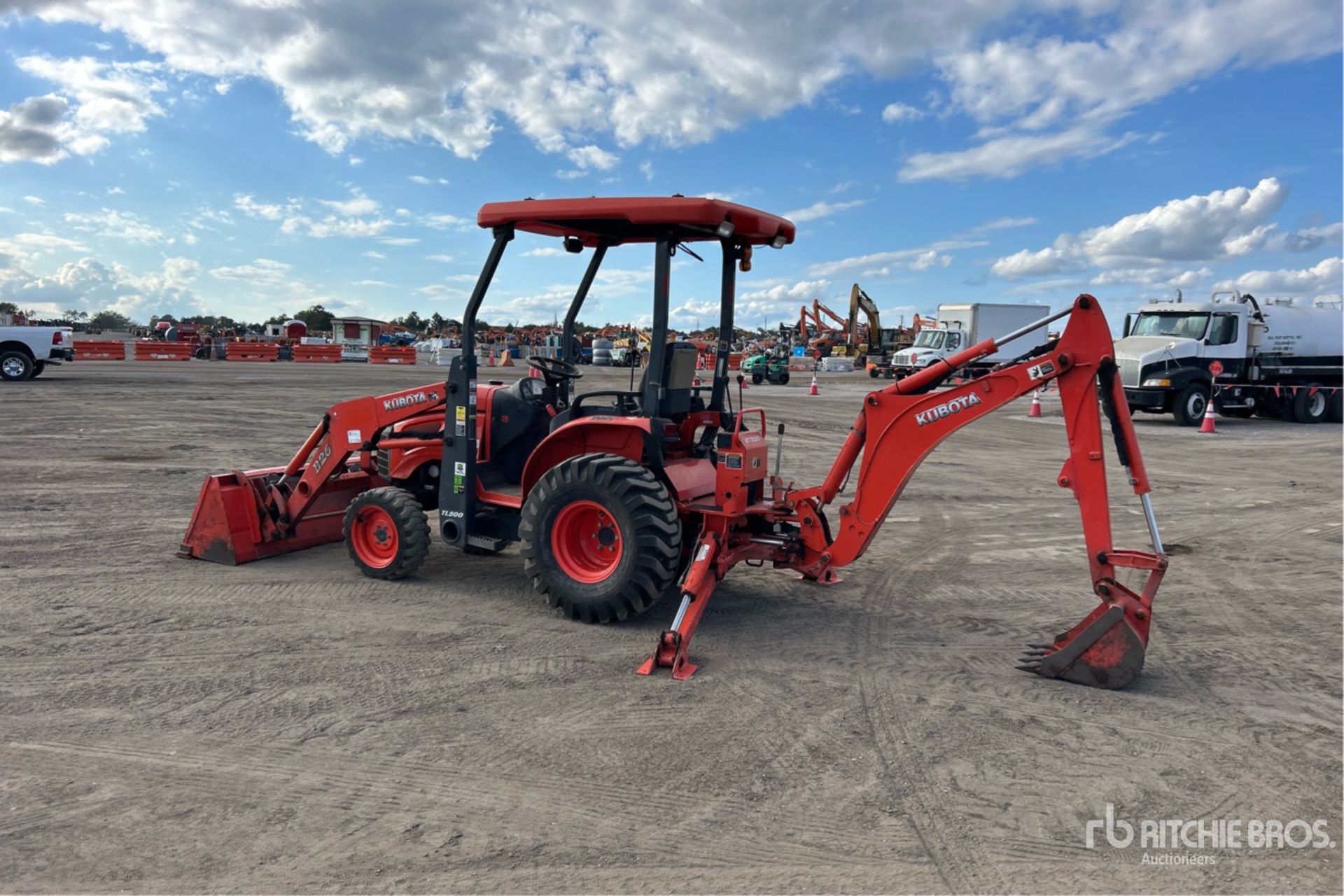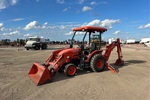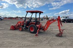 Located in Spot 207, Canopy, 3 Forward 3 Reverse, Hydrostatic Drive, 26 hp Engine, Kubota TL500 Loader w/Joystick, Quick Coupler, Kubota TL2142 60 in Bucket, Kubota BT820 Backhoe Attachment With 18 in Bucket, 23x8.50-14SS Front Tires, 12.4-16 Rear Tires