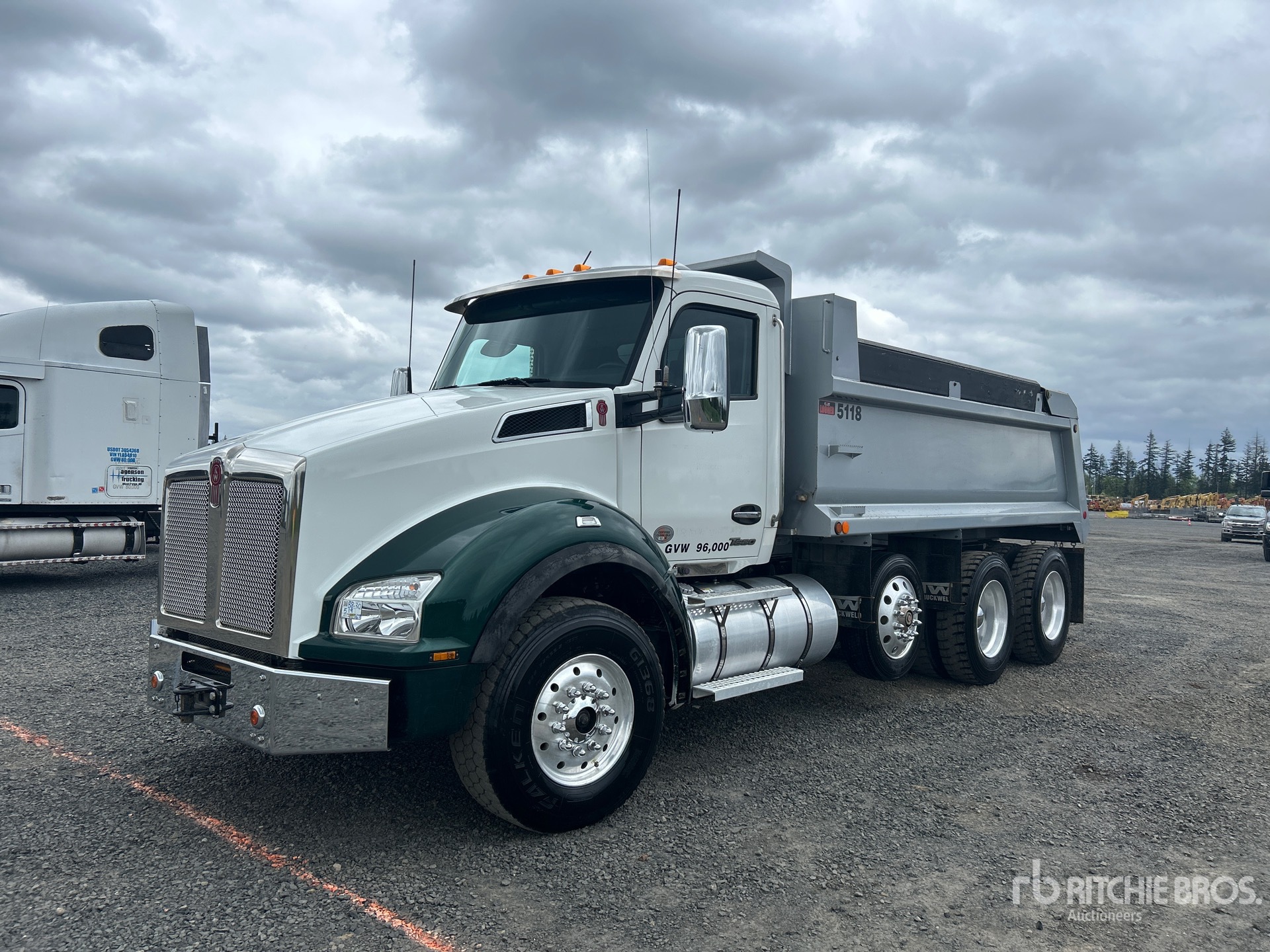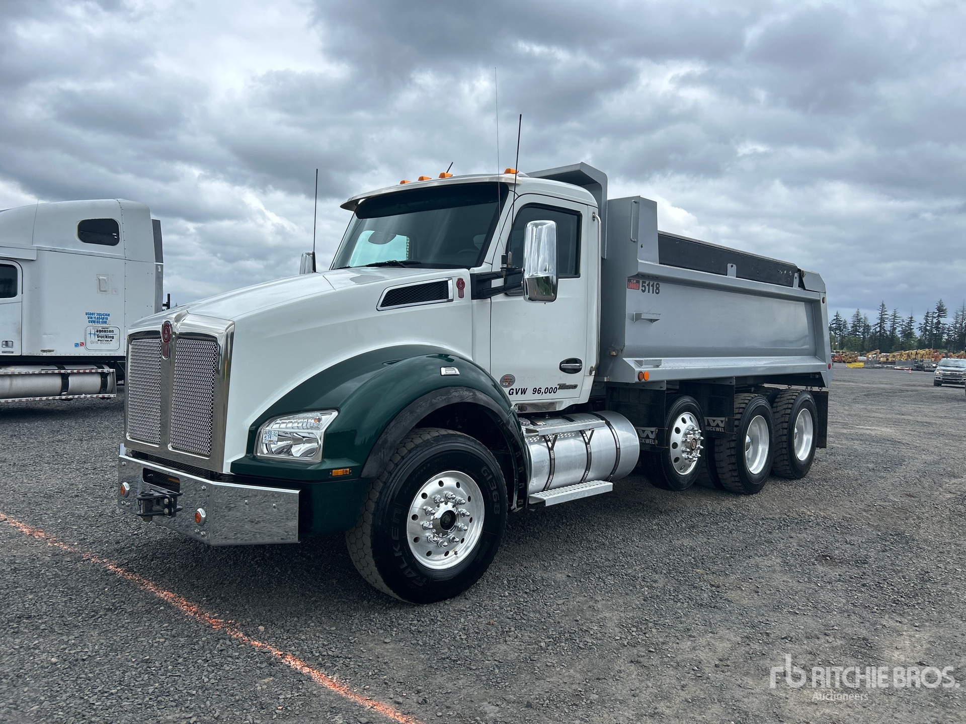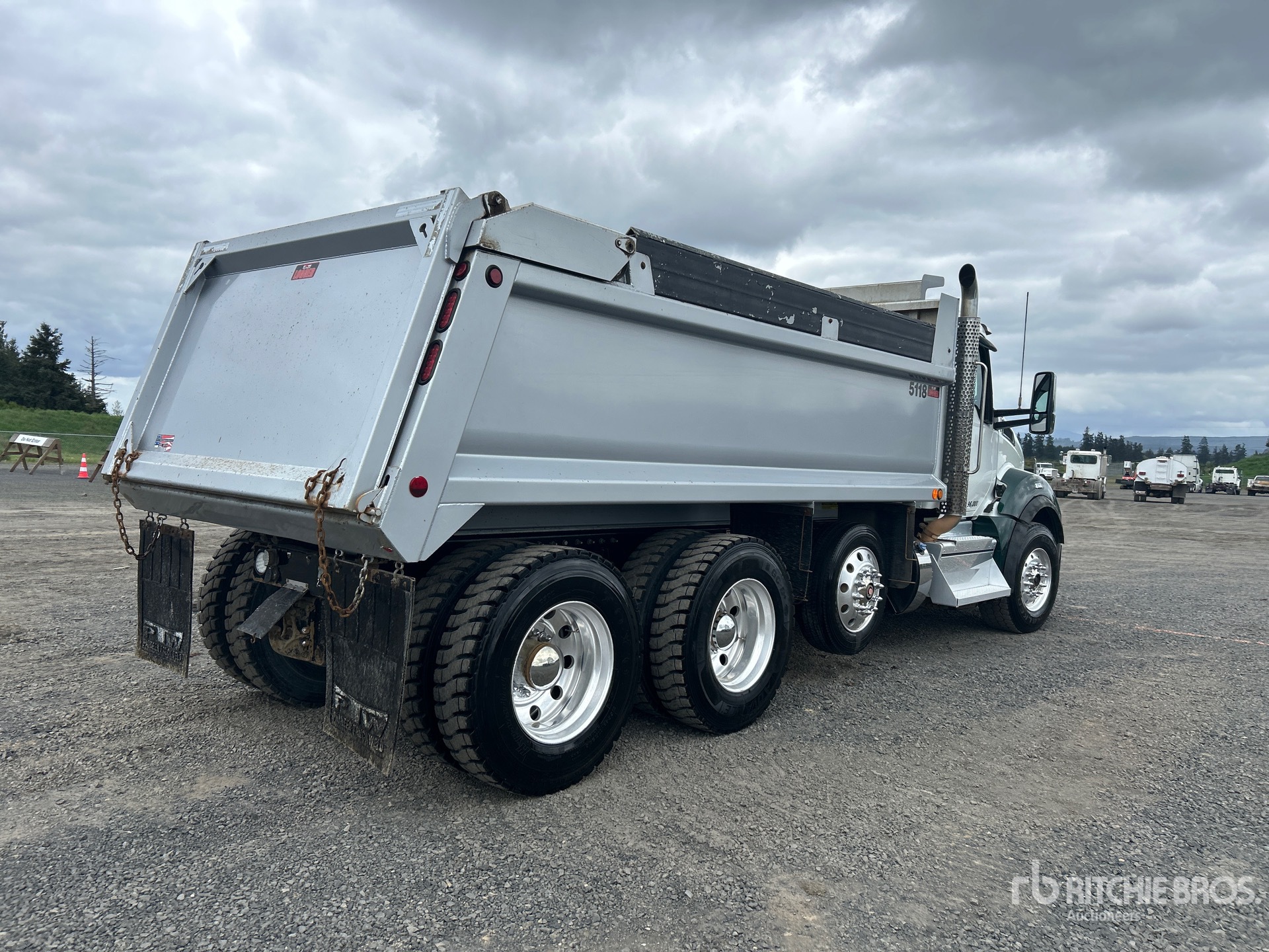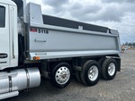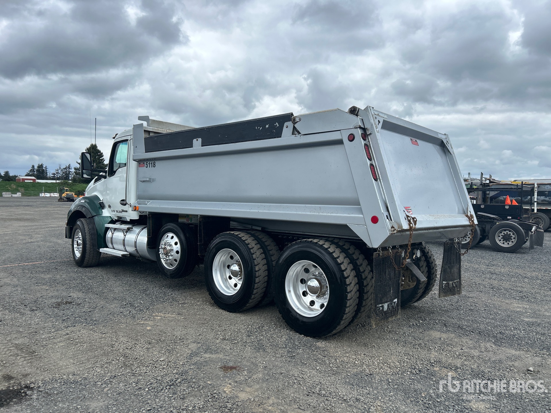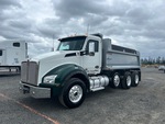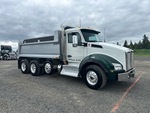 Located in Lane 2 Spot 9, Cummins X15 6 Cylinder 15.0 L Diesel 525 hp Engine, 2023 US EPA Label, Requires Diesel Exhaust Fluid, 4823 Engine hrs, Engine Brake, Eaton Fuller 18-Speed Manual Transmission, Double Differential Locks, 14600 lb Front Axle, 46000 lb Rears, 71620 lb GVWR, Air Ride Cab, Aluminum Wheels, 385/65R22.5 Front Tires, 11R24.5 Rear Tires, Steerable Air Lift Pusher Axle, Hendrickson Haulmaax Rubber over Walking Beam Suspension, 216 in Wheelbase, PTO, PTW 16 ft 6 in Long x 3 ft High Steel Body, 18.9 cyd, Capacity, High-Lift Tailgate, Rear Hydraulics, Pintle Hitch, Equipment-from-Green-Diamond-Resource-Company
