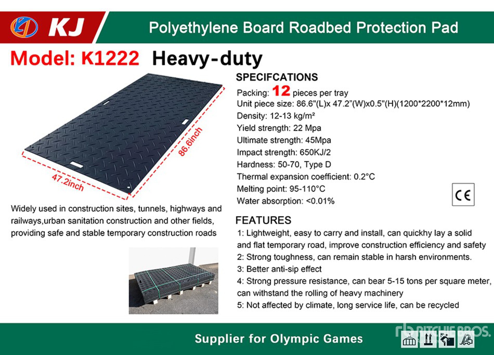 Quantity of (12) 2026 KJ K1222 86 in x 47 in Polyethylene Traffic Plates 交通制御 (Unused)